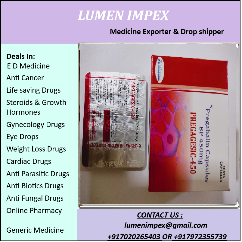 PREGAGESIC 450 MG contains Pregabalin, a medication used to manage neuropathic pain and certain types of seizures. With a potent 450 mg dosage, it targets nerve pain resulting from conditions like diabetic neuropathy and postherpetic neuralgia. PREGAGESIC helps reduce pain and discomfort by modifying nerve signal transmission, enhancing overall quality of life.