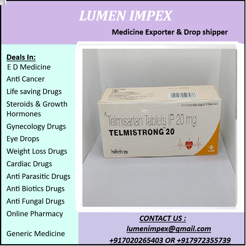 20mg Telmisartan tablets are prescription medicines used to manage high blood pressure (hypertension), reduce the risk of heart attacks and strokes in high-risk adults, and protect kidney function in patients with diabetes. As an angiotensin II receptor blocker (ARB), it relaxes blood vessels to improve blood flow, reducing strain on the heart. Key
