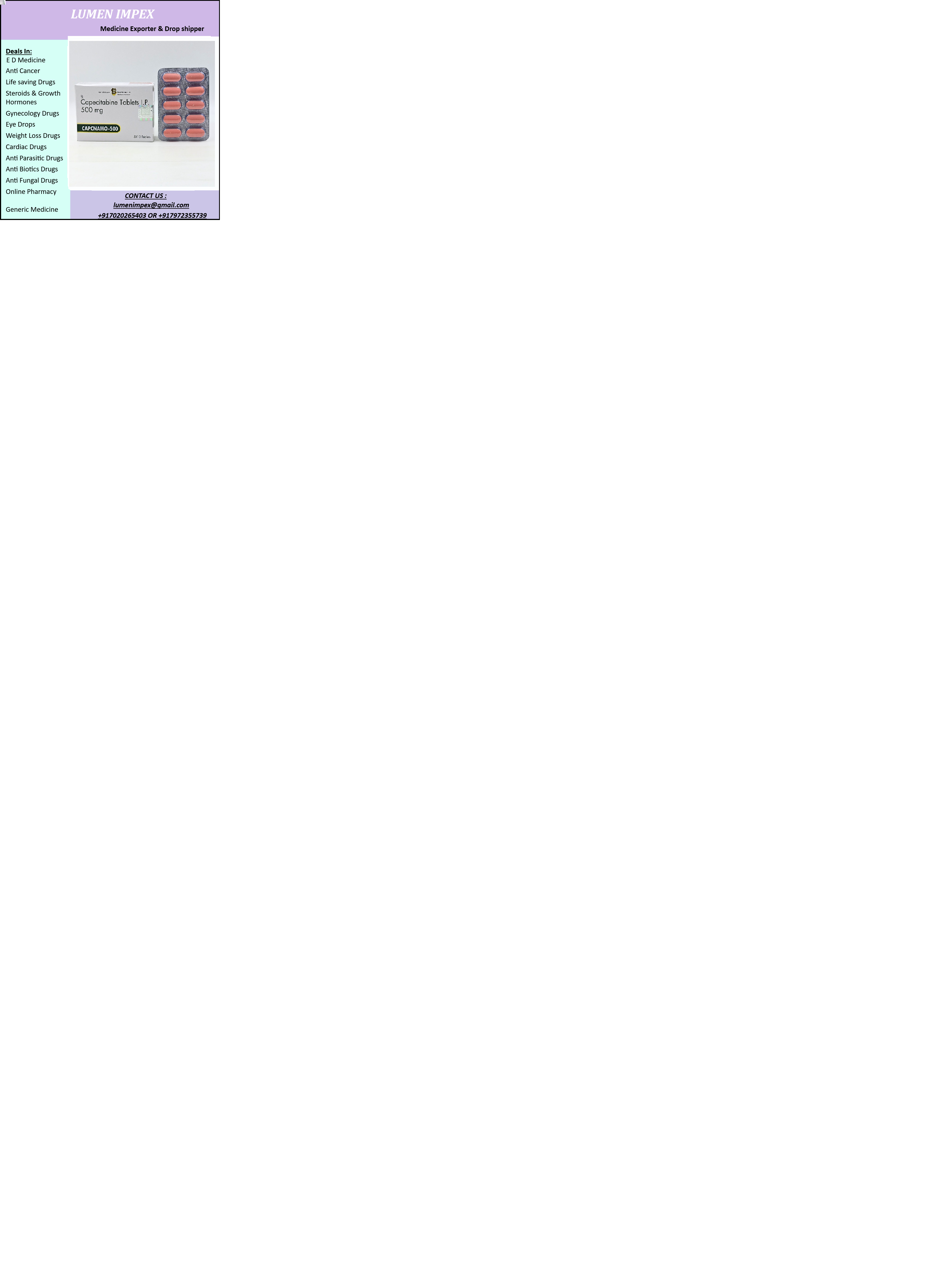 CAPCNAMO 500 Tablet is used in the treatment of cancer of breast, colon, and rectum. It may be also used to treat other conditions, as determined by the doctor. It is used alone or in combination with some other medicine as a part of chemotherapy.