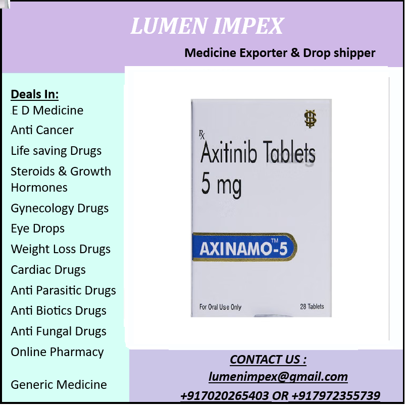 AXINAMO 5mg Tablet is an anti-cancer medicine used in the treatment of kidney cancer. AXINAMO 5mg Tablet can be taken with or without food, but try to have it at the same time every day to get the most benefits. Your doctor will decide what dose is necessary and how often you need to take it. This will depend on what you are being treated for and may change from time to time. You should take it exactly as your doctor has advised. Taking it in the wrong way or taking too much can cause very serious side effects. It may take several weeks or months for you to see or feel the benefits but do not stop taking it unless your doctor tells you to. The most common side effects of this medicine include high blood pressure, joint pain, and loss of appetite. Diarrheal, shortness of breath, can be serious sometimes so take medicine to treat it as prescribed by the doctor or stay hydrated. Your doctor may advise for regular blood pressure checkups while you are taking this medicine. Inform your doctor if you notice a severe headache, confusion, problems with your eyesight, nausea or vomiting. Before taking it, tell your doctor if you have thyroid problems, liver or bleeding problems or are taking any medicines to treat infections. Many other medicines can affect, or be affected by, this medicine so let your healthcare team know all medications you are using. This medicine is not recommended during pregnancy or while breastfeeding. The use of effective contraception by females during treatment is important to avoid pregnancy.