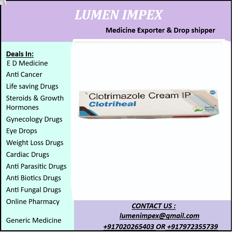 Clotriheal 30g cream, manufactured by Healing Pharma, is an antifungal medication used to treat various fungal skin infections. It contains clotrimazole, which works by damaging the fungal cell membrane, thus inhibiting fungal growth and providing relief from symptoms like itching and redness. It is specifically indicated for conditions like ringworm, athlete's foot, jock itch, and other fungal infections.