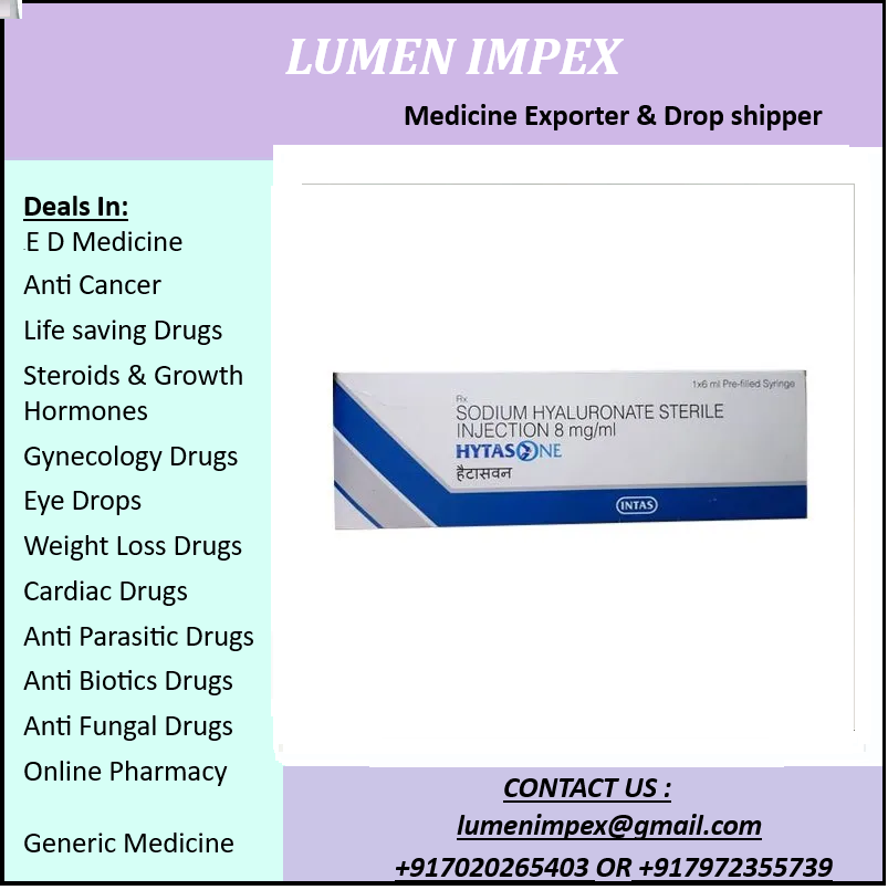Hytasone is a sterile sodium hyaluronate injection (8 mg/ml) manufactured by Intas Pharmaceuticals Ltd.. It is primarily used to treat pain and inflammation caused by osteoarthritis of the knee, particularly in patients who haven't responded well to standard painkillers or physical therapy.