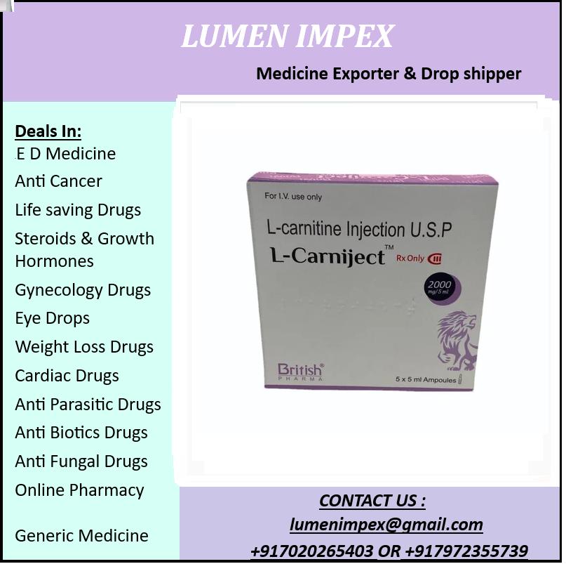 L-Carniject Injection contains L-Carnitine, a naturally occurring nutrient compound that plays a role in energy metabolism and fatty acid transport within the body. In regulated medical contexts, injectable L-Carnitine has been used under strict professional supervision for specific metabolic deficiencies or clinical conditions requiring targeted nutrient support. Its administration requires precise dosing, careful monitoring, and oversight by qualified healthcare professionals to ensure safety and effectiveness. Any handling or administration must occur only under appropriate clinical guidance to ensure safety, proper assessment, and adherence to established therapeutic and regulatory standards.