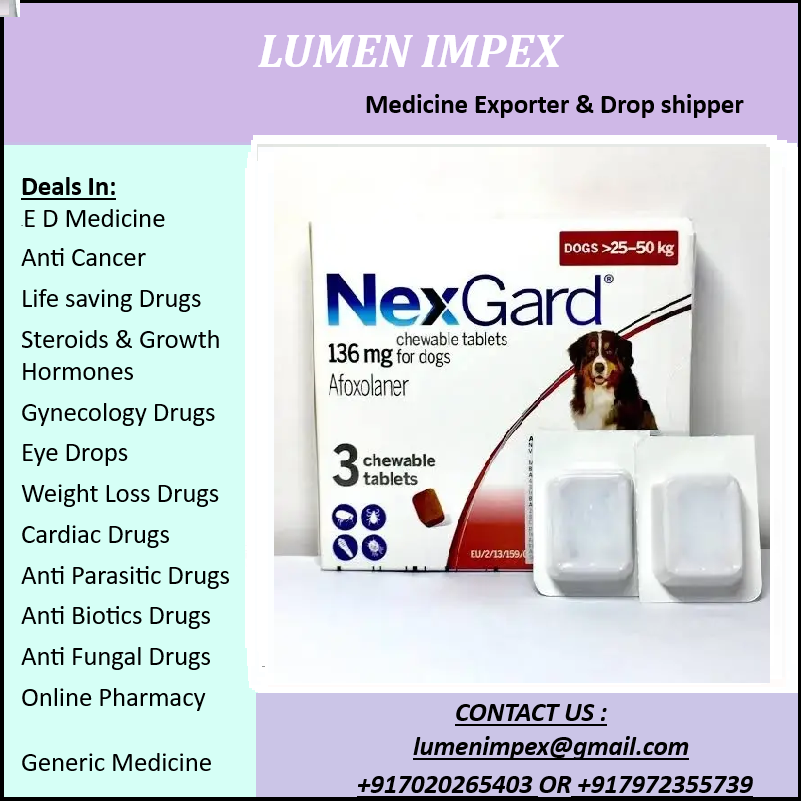NexGard 25 to 50 kg afoxolaner chewable tablets (136 mg) are used for the treatment and prevention of flea and tick infestations in dogs. They also help treat certain types of mange and can aid in preventing tick-borne diseases like Lyme disease. Flea Control: The tablets kill adult fleas rapidly (within 8 hours of attachment) and prevent further infestations by killing fleas before they can lay eggs, thus breaking the flea life cycle. Tick Control: They are effective against several common tick species, including the American dog tick (Dermacentor variabilis), black-legged (deer) tick (Ixodes scapularis), Lone Star tick (Amblyomma americanum), and brown dog tick (Rhipicephalus sanguineus). They work within 48 hours of tick attachment. Mange Treatment: NexGard is also used to treat demodectic mange (Demodex canis) and sarcoptic mange (Sarcoptes scabiei var. canis), which are skin infestations caused by mites. Disease Prevention: By killing ticks, the product helps reduce the risk of contracting serious tick-borne illnesses such as Lyme disease. Flea Allergy Dermatitis (FAD): It can be used as part of a treatment strategy for managing FAD, an allergic reaction to flea bites.