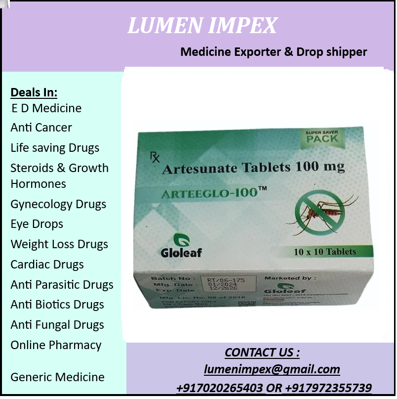 Arteeglo 100mg is an allopathic antimalarial medication containing the active ingredient Artesunate. It is primarily used to treat infections caused by Plasmodium falciparum, the parasite responsible for severe and complicated malaria.